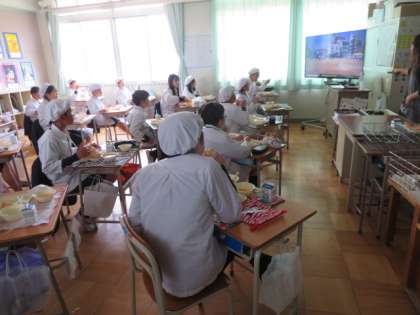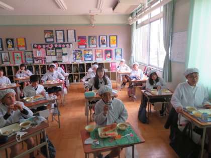 6年生の教室では、卒業お祝い献立を美味しく味わっていました。