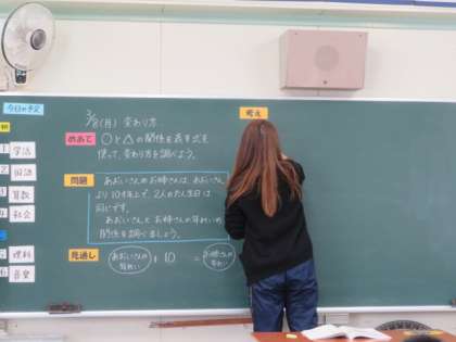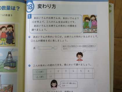 算数の授業で「変わり方」の学習をしました。なかなか難しい内容ですが、関係の式を立てるとよいということが理解できました。