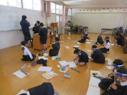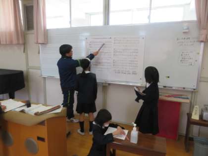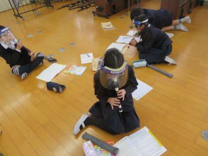 音楽室で、ディスタンスをとって、リコーダーの練習をしていました。
