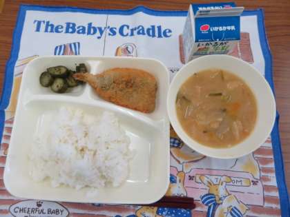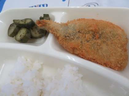 献立は、いわしのフライ、みそ汁、きゅうりの赤紫蘇あえ、ごはん、牛乳でした。