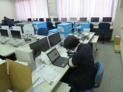 昨日搬入された児童一人に一台ずつの端末の設定作業をしていただいています。