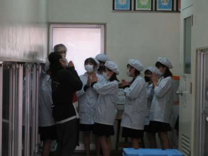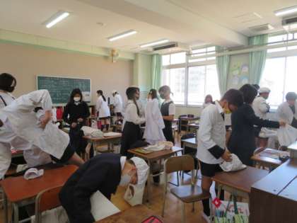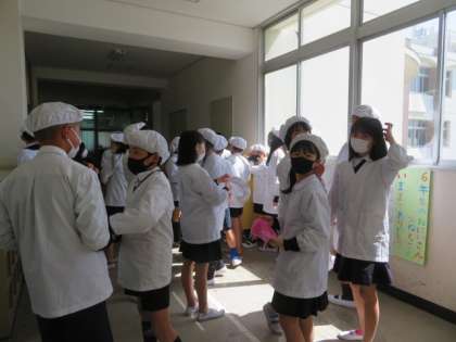 給食当番は、給食衣を着て最後の給食を取りに行きました。