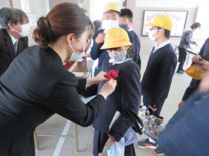 今年は5年生が参加していないこともあり、元担任の先生が6年生にコサージュをつけています。