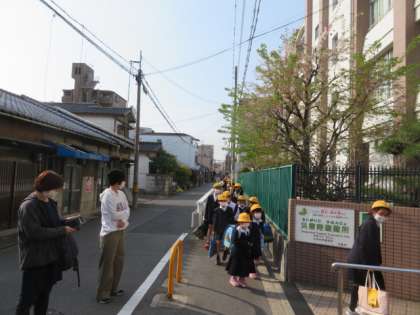 新一年生の保護者の方も付き添っていただいたりして、班長を先頭に無事に登校してきました。