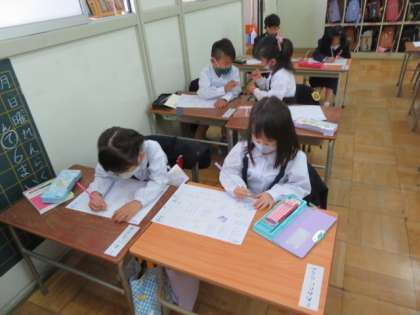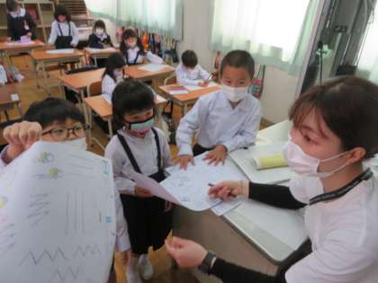 1年2組では、書写指導の初めとして、いろいろな線をなぞってしっかりと書いていました。