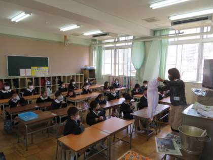 1年1組では、今日から始まる給食について、栄養教諭からの指導をしていました。