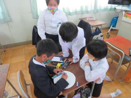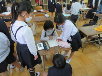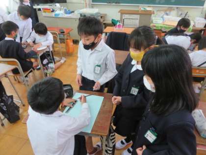 4年2組では、学級の係について話し合いが行われ、各係で画用紙に活動計画やめあて、メンバーの紹介などを書いていました。
