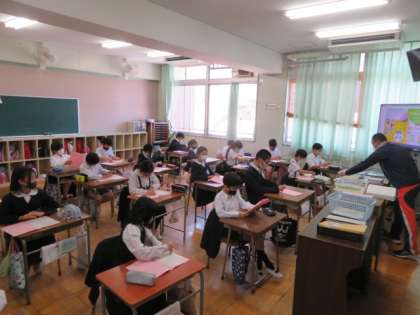 5年1組では、一日の振り返りプリントや自主学習のプリントについての取り扱いの説明が行われていました。