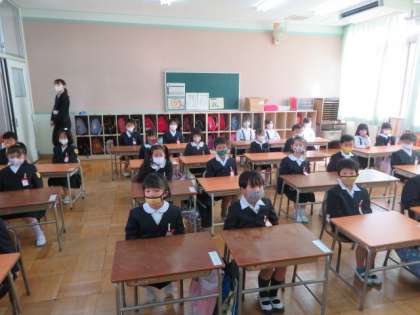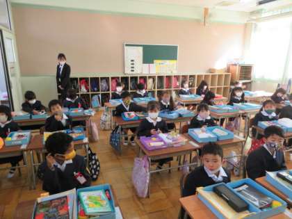 1年生の子どもたちは、児童朝会が始まるまでに自分のランドセルを決められたロッカーにきちんとそろえて入れていました。