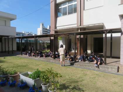 1年生が、学級ごとに写真撮影に備えてきちんと待っていました。