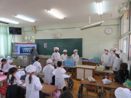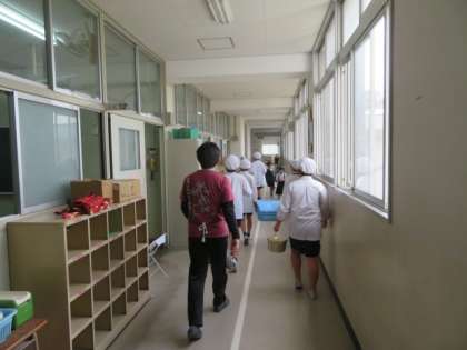 6年生が、1年生給食の食器やおかず牛乳などの搬入をしています。