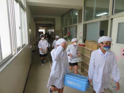 6年生は、3時間目の学習を終えたら担当児童が着替えて給食室から運んできます。