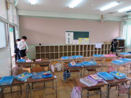 1年生はすでに下校しており、1年生の教室や廊下を6年生たちが掃除をしています。