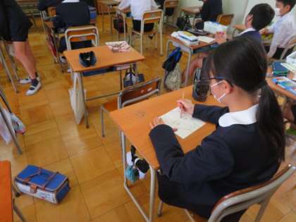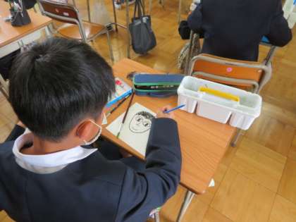 教室の掲示用に使う自分の似顔絵を一生懸命に描いていました。