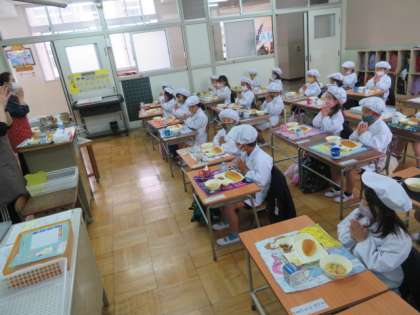 自分の目の前にある給食がそろっているか、献立を確認してからいただきますのあいさつをします。