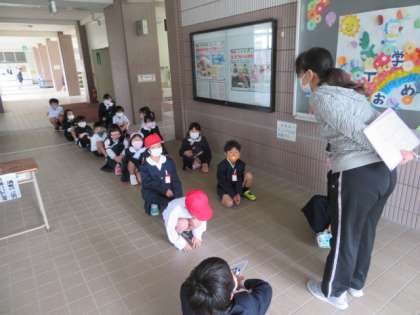 その後事前の指導や確認の後に、順に玄関に集まってから、決められた道を歩きながら交通安全指導を受けます。