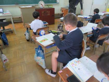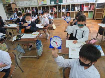 時間と時こくについて、教材の時計を操作しながら学習していました。