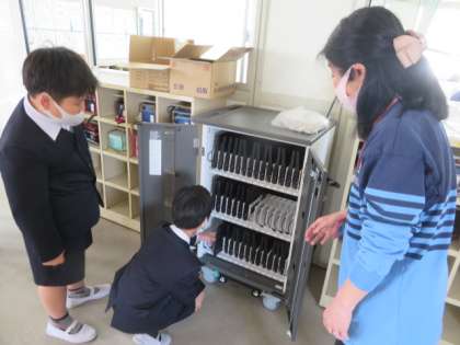 学校が臨時休業になった際の家庭でのオンライン学習、リモート授業の実施に向けて、一人一台端末のテスト使用を5年2組から行いました。