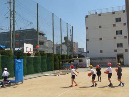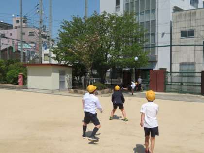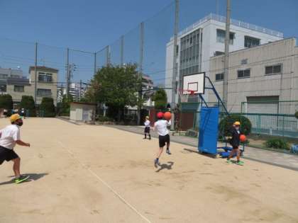 運動場で、汗もかきながら楽しく遊ぶ子どもたちです。