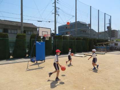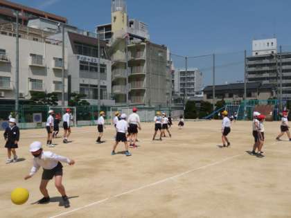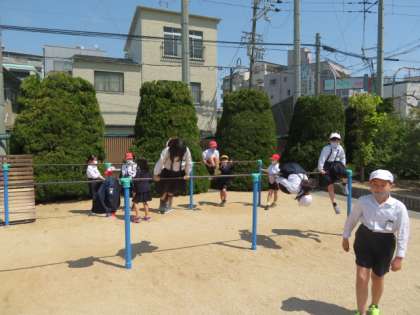 とても天気がよく爽やかな風が吹いている運動場で、大勢の子どもたちが運動遊びを楽しんでいました。