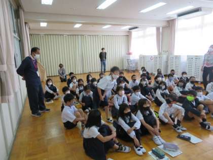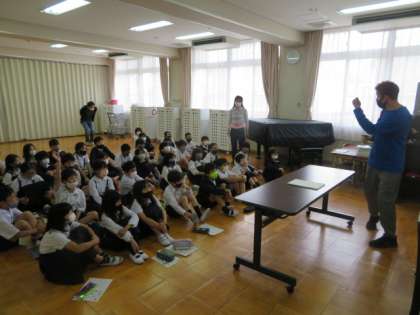1・2組合同で、多目的室で英語の学習をおこないました。