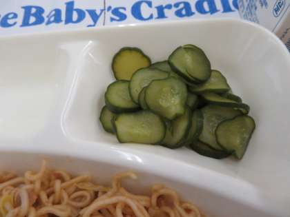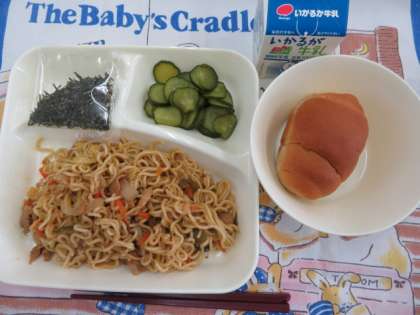 献立は、焼きそば、きゅうりのしょうが漬け、1/2黒糖パン、牛乳でした。