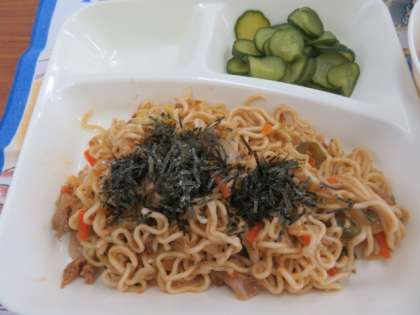 焼きそばも、子どもたちに人気のメニューの一つです。きざみのりを振りかけて、とてもおいしくいただきました。