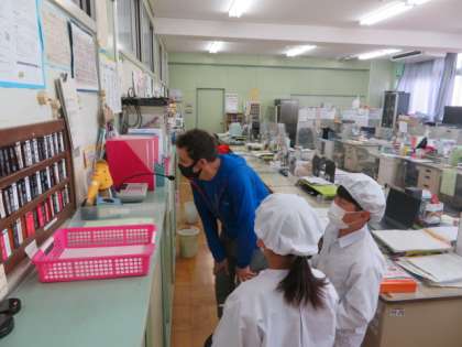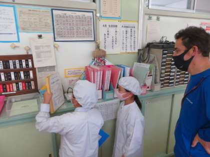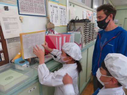 緊急事態宣言発令中ですが、今日も給食委員会児童とともにC-NETのマーク先生に英語でメニューを紹介していただきました。