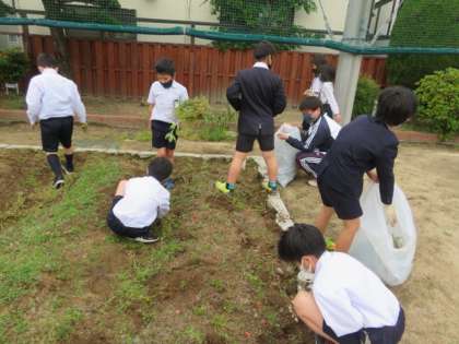 この時間、課題をすませた児童が4年生の学習園の雑草抜き作業を進んでしていました。