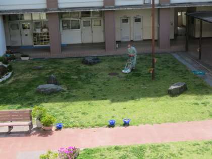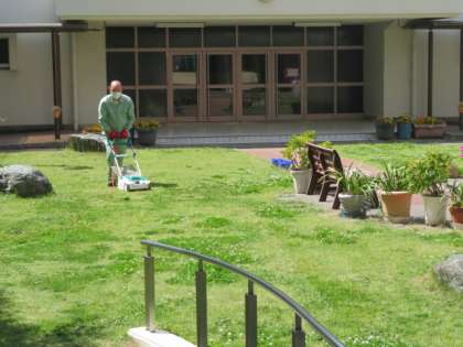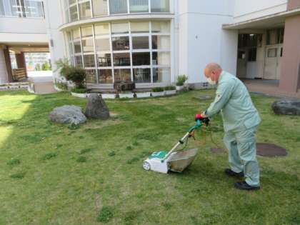 中庭の芝生やクローバーが伸びてきていたので、管理作業員が芝刈り機で刈っていました。