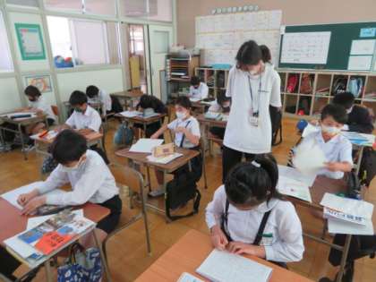 検査を終えた児童が、教室へ戻ってきて課題のプリント学習をしています。