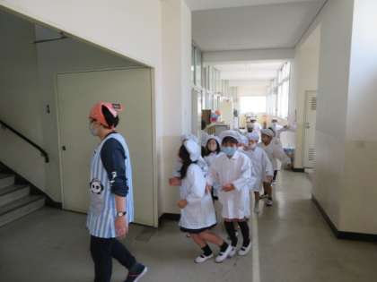 どの学級も、各担任と給食当番児童が安全面を第一に給食を運びます。