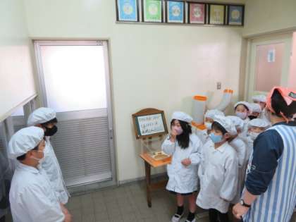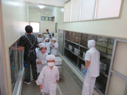 給食室では、給食調理の皆さんにきちんとあいさつをしてから給食を受け取ります。