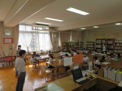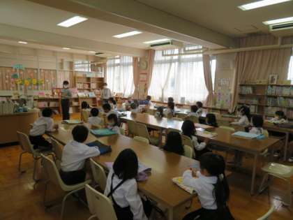 1年1組は、図書室で図書館補助員より図書室の使い方や本の貸し出しについての指導を受けていました。