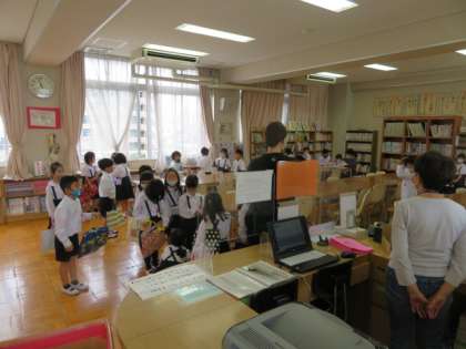 1年2組が図書室で、図書館補助員に図書室の使い方や本の借り方などについて指導していただきました。