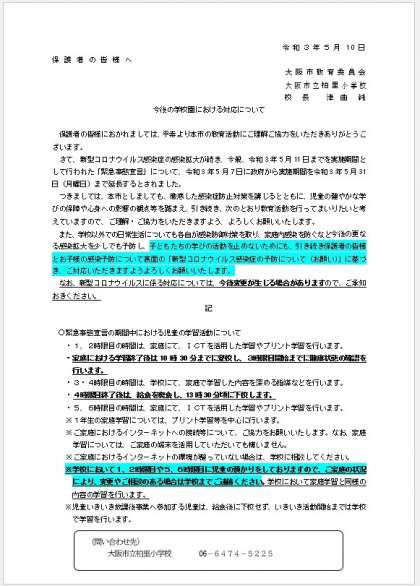 これにともないまして、1・2時間目、5・6時間目の学校預かりについて、変更、ご相談等がございましたら、学校へ連絡をいただきますようよろしくお願いいたします。