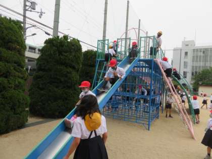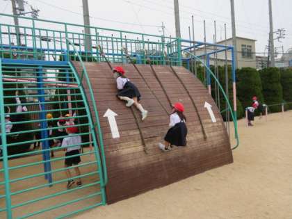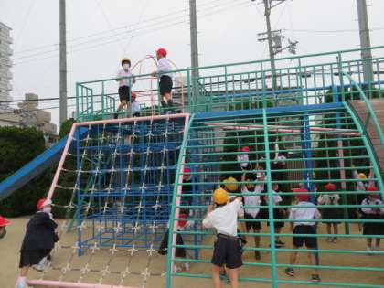 固定遊具でも、安全面に気をつけ声を掛け合ったりしながらよく遊んでいました。