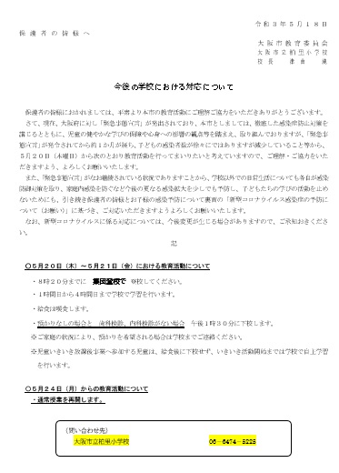 本日、大阪市教育委員会より通知があり、大阪市小、中学校、幼稚園が5月24日、月曜日から通常授業・活動を再開することになりました。