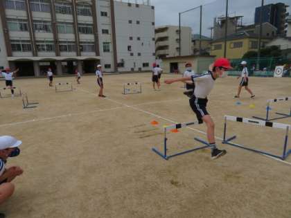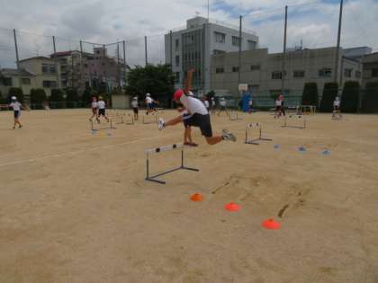ハードル走の踏切り、ハードルをまたぐ姿勢、着地などのポイントについて、みんなで確認していました。