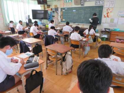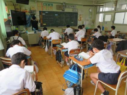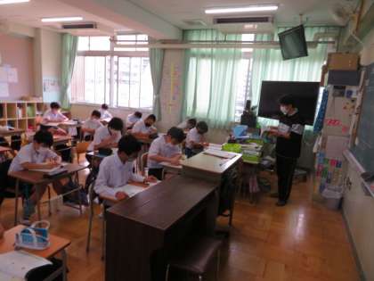 分数のかけ算の学習を学年を3分割して習熟度別少人数で行っています。