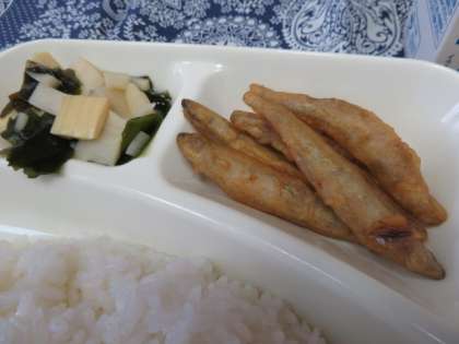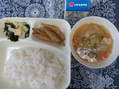 献立は、きびなご天ぷら、豚汁、若竹煮、ごはん、牛乳でした。
