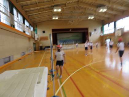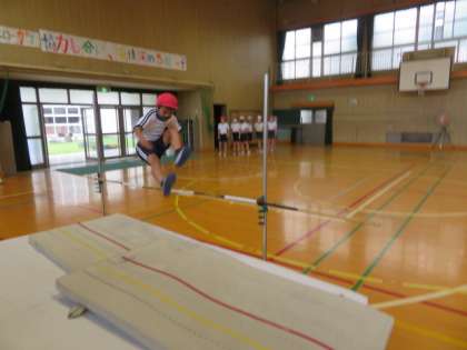 各班ごとに分かれ、それぞれに高さを調節して走り高跳びをしていました。