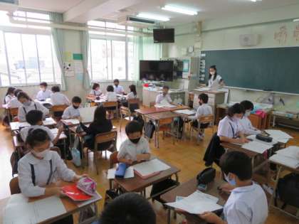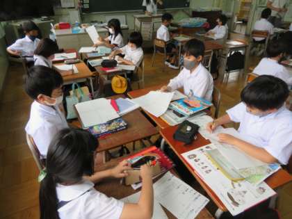 「たしかめながら話を聞こう」の学習で、それぞれのグループ内で各自が選んだ本の紹介を聞き合う活動をワークシートに書き込んだことをもとに展開していました。