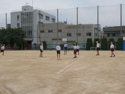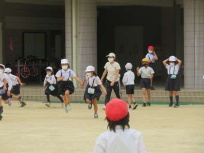 梅雨の合間に、運動場へ出て遊ぶ子どもたちです。