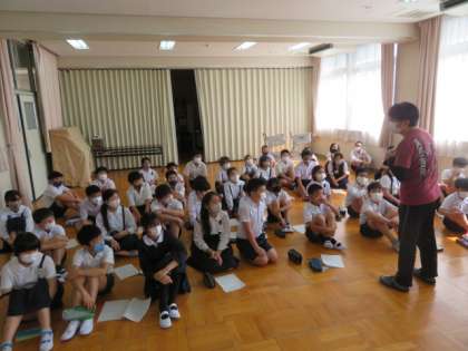 通常授業再開にともない、6年生が縦割り班活動の編成に向けて、今後の活動についての方針や説明を聴いていました。