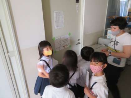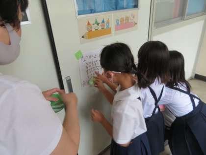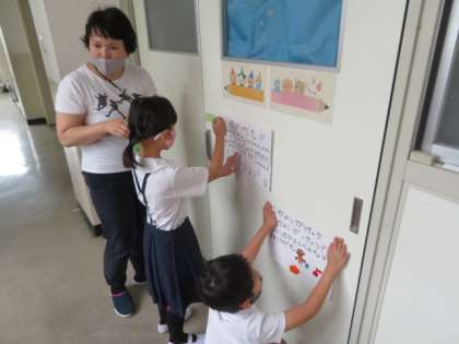 1年生との学校たんけんに向けて、各教室の手作り表示を貼り回っていました。