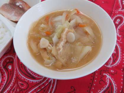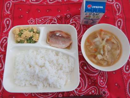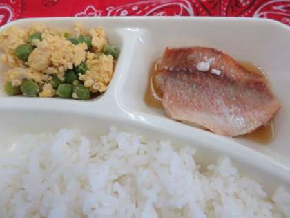 献立は、赤魚のしょうゆだれかけ、みそ汁、えんどうの卵とじ、ごはん、牛乳でした。