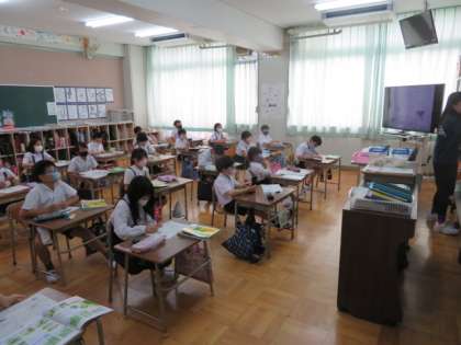 「チョウの育ち」で、チョウの育て方のワークシートをもとにアゲハチョウの幼虫を育てるうえで、気をつけることなどを話し合っていました。