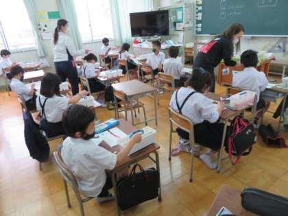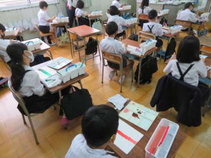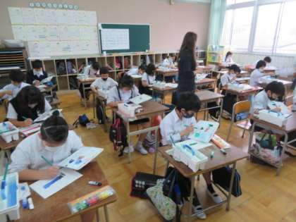 水彩絵の具で、主になる好きな色を決めて、その色のグラデーションをていねいに描いていました。