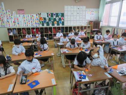 折り紙を折りたたんで、はさみで切ったり切れ込みを入れたりして、ちょきちょきかざりを作っていました。